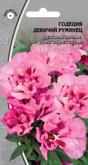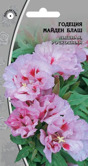 Смесь однолетней махровой годеции. Куст компактный, высотой 60 см. Цветки колокольчатые, махровые, атласные, диаметром 8 см, собраны в кистевидные соцветия, которые вытягивается по мере распускания новых бутонов. Цветет обильно и продолжительно с июня до глубокой осени. Годеция неприхотлива, холодостойка. Используется для украшения балконов, в рабатках, клумбах, групповых посадках, подходит для уличных вазонов и срезки. Посев производят в апреле-мае прямо в грунт или в марте-апреле, в условиях теплицы или парника, посевы прореживают, выдерживая расстояние между растениями 15-20 см. Чтобы поддерживать обильное и продолжительное цветение, обязательно отщипывают завязи. Годеция предпочитает расти на солнечных участках с суглинистыми, окультуренными почвами, не выносит переувлажнения.