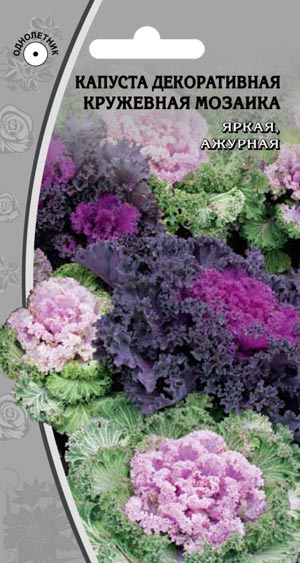 КАПУСТА декоративная Кружевное жабо F1, Это растение высотой до 60 см, двулетнее, выращивается как однолетник. Курчавые листья с сильногофрированными краями имеют зеленую, белую, кремовую или пурпурно-фиолетовую окраску, наиболее декоративны в конце лета –- начале осени. Светолюбива, предпочитает богатые гумусом почвы; холодостойка, выдерживает во взрослом состоянии заморозки до -8-12 °C, в возрасте рассады –- до -4 °C. Размножают семенами. На рассаду высевают в конце марта. При температуре почвы 18-20 °C всходы появляются через 3-5 дней. Землю проливают до и сразу после посева, молодые всходы лишь немного опрыскивают и начинают поливать, когда они окрепнут. Выращивают рассаду при температуре 12-16 °C. В конце апреля — начале мая ее высаживают в грунт через 50-60 см. Капуста отзывчива на полив, рыхление и подкормку минеральными удобрениями. При подкормке навозом в окраске преобладают зеленые тона. Идеальна для одиночных и групповых посадок, используется как обсадочное растение. Пересаженная осенью в контейне