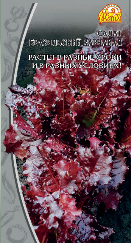 Суперраннеспелый (25-30 дней до технической спелости) высокоурожайный, устойчивый к стеблеванию сорт листового салата, для всех регионов. Формирует полуприподнятую, компактную розетку диаметром 23-26см. В розетке 12-15 шт. темно-красных листьев длиной 14-17 и шириной 15-20 см. Край листа волнистый, мелкозубчатый. Вкус нежный и хрустящий, без горечи. Рекомендуется для диетического питания в свежем виде и использования в домашней кулинарии.